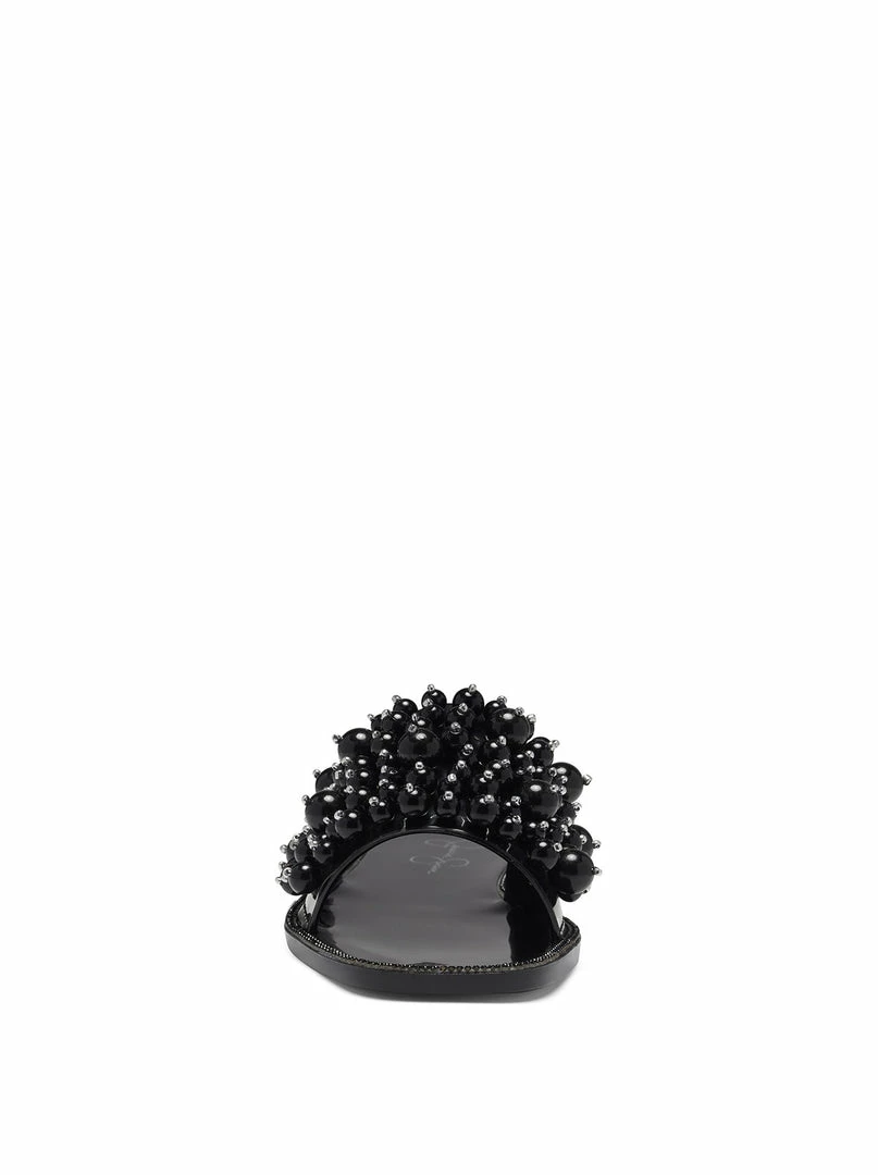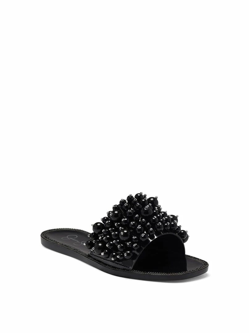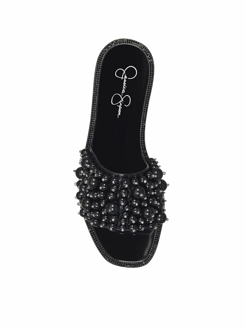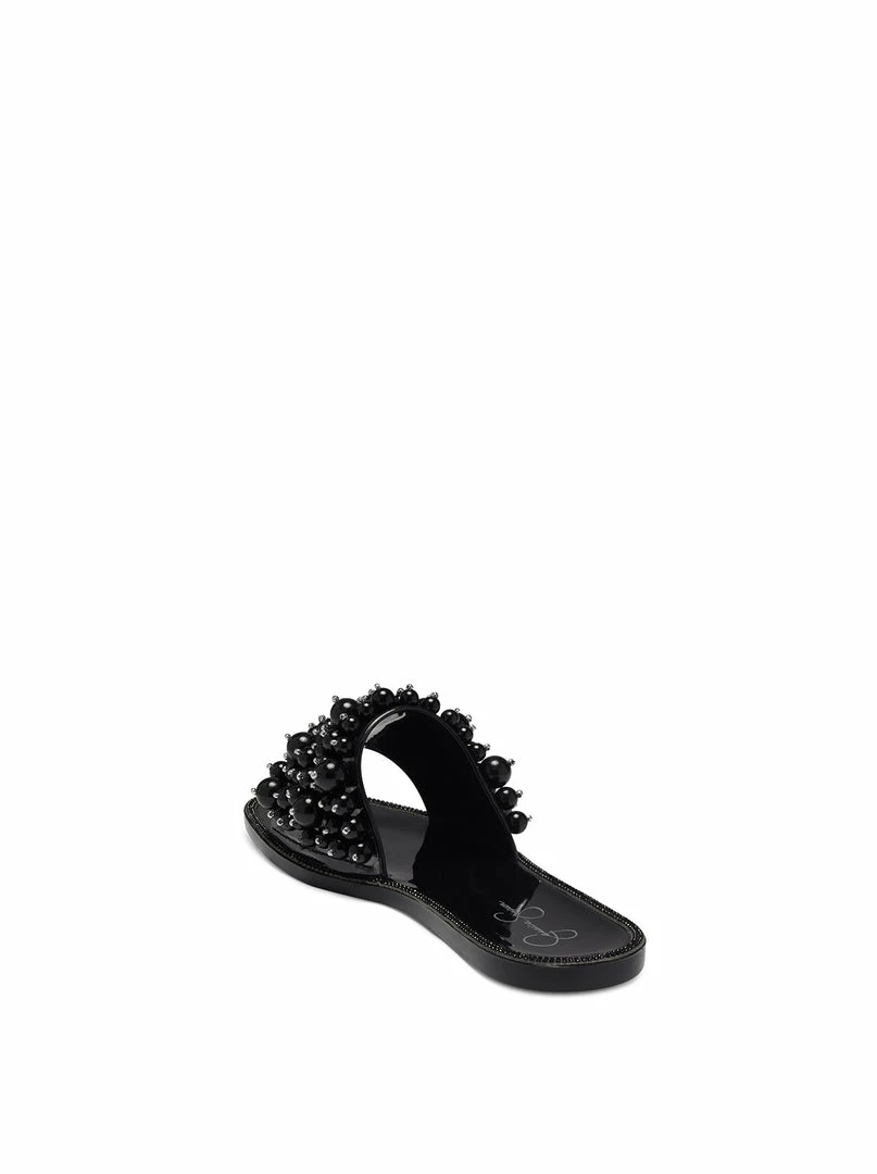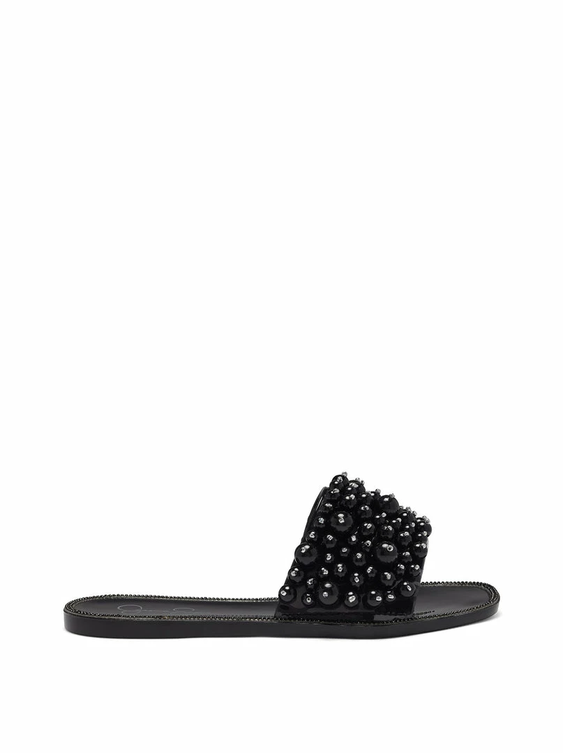 Low heeled jelly slide with pearl beaded upper.