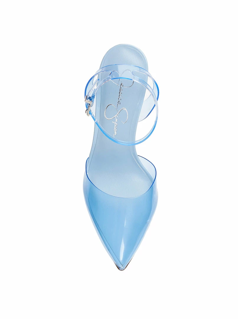 High Heel in PVC with a closed toe and ankle-strap closure.