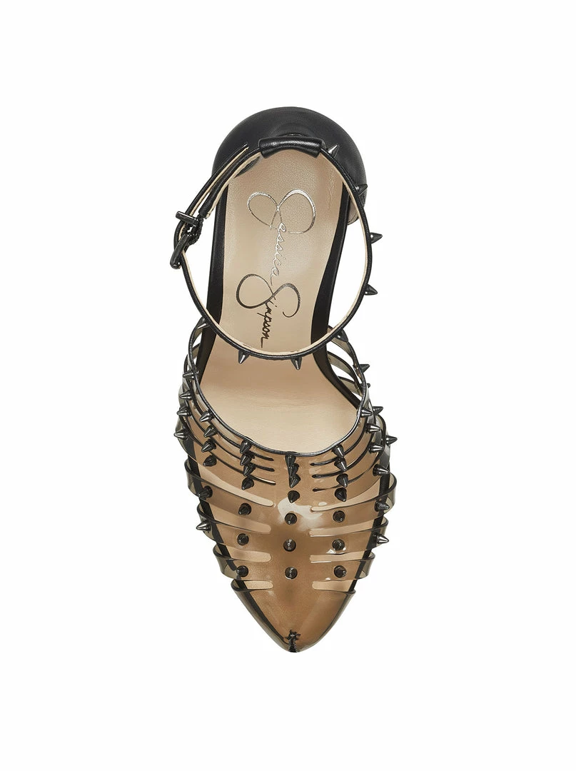 High heel shoe with ankle strap and studs.