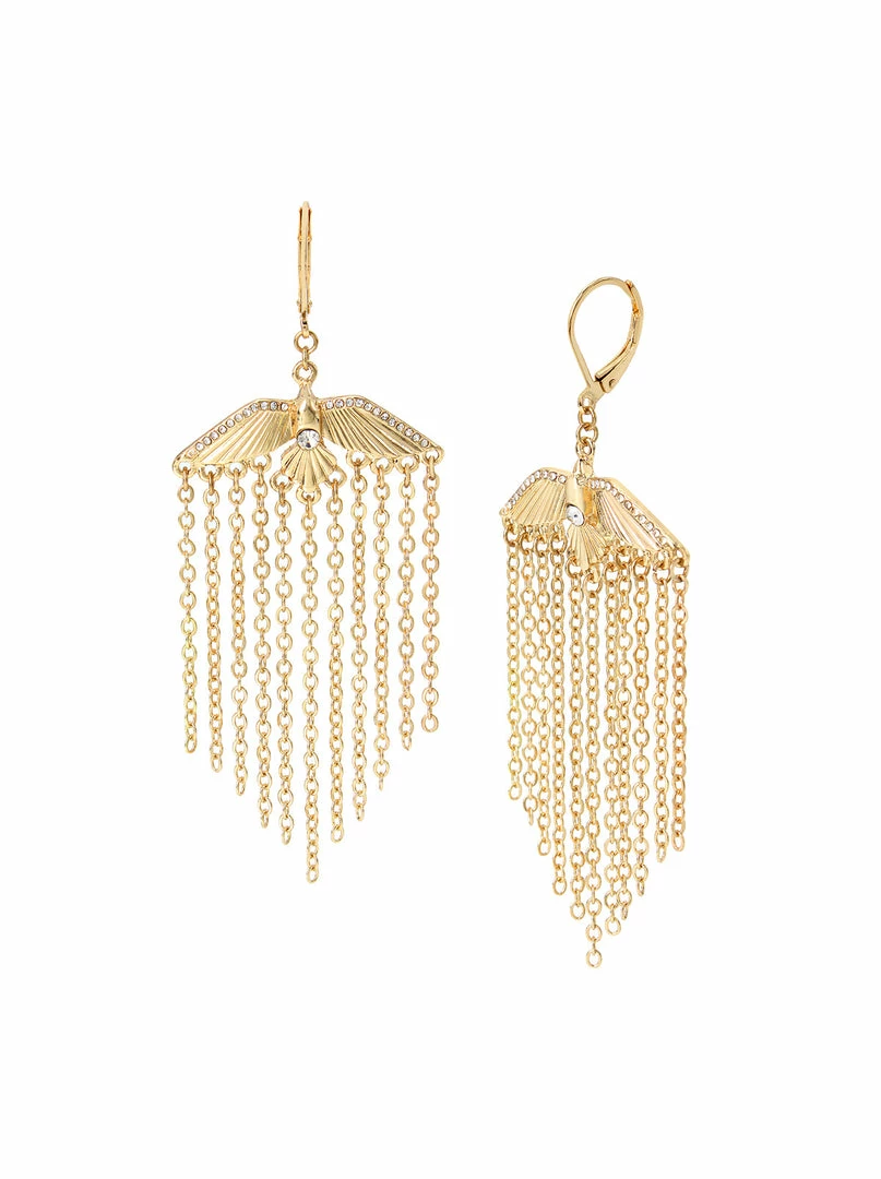 Unique chandelier earrings featuring playful bird adorned with delicate crystal accents and striking chain fringe. These chic earrings are set in gold-tone metal and have a lever back closure.
