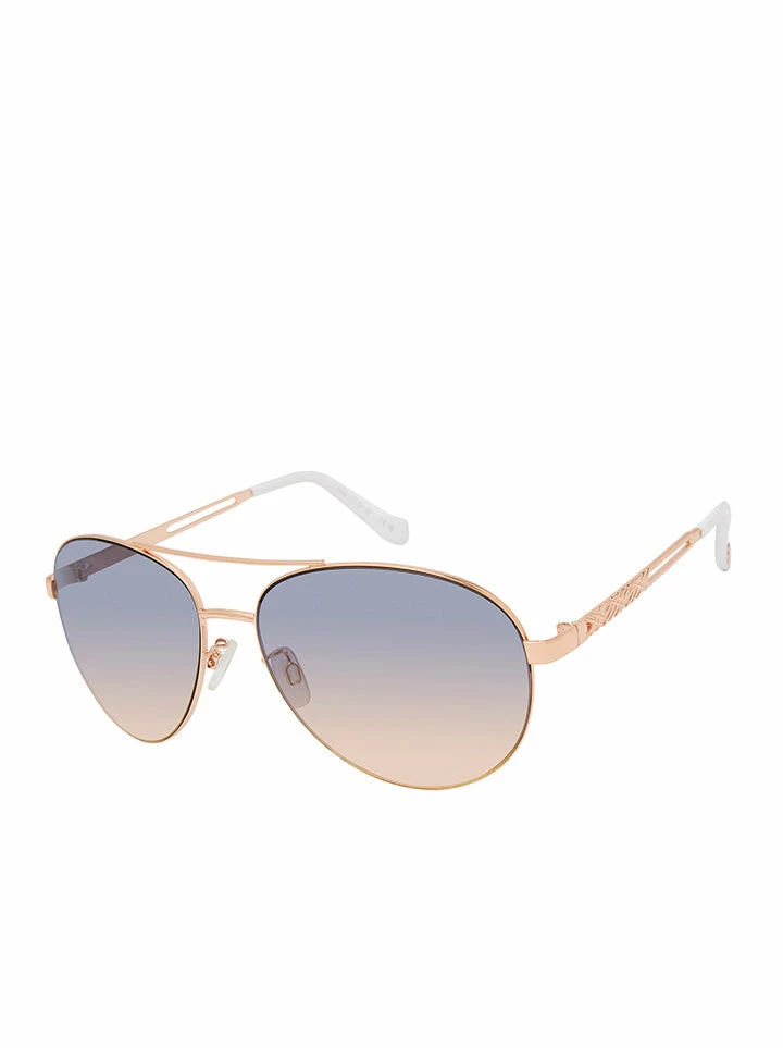 - Frame Color: Rose Gold & White. Lens Color: Navy to Peach with Light Flash.