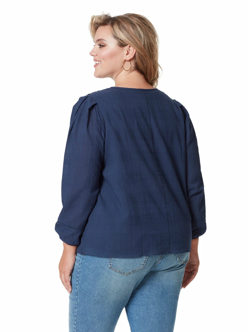 Long Sleeve V-Neck Pleated Blouse with Front Detail and Balloon Sleeves