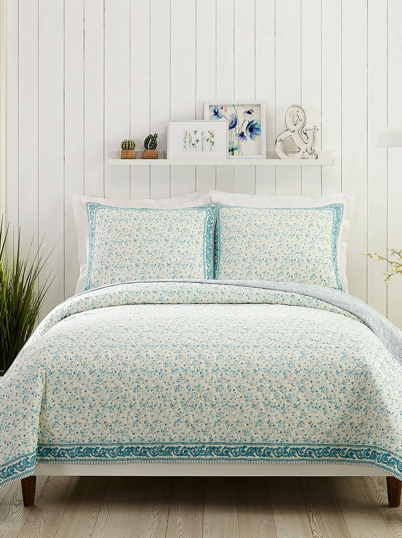Dainty blue and white floral print quilt. Matching shams and decorative pillows are sold separately.