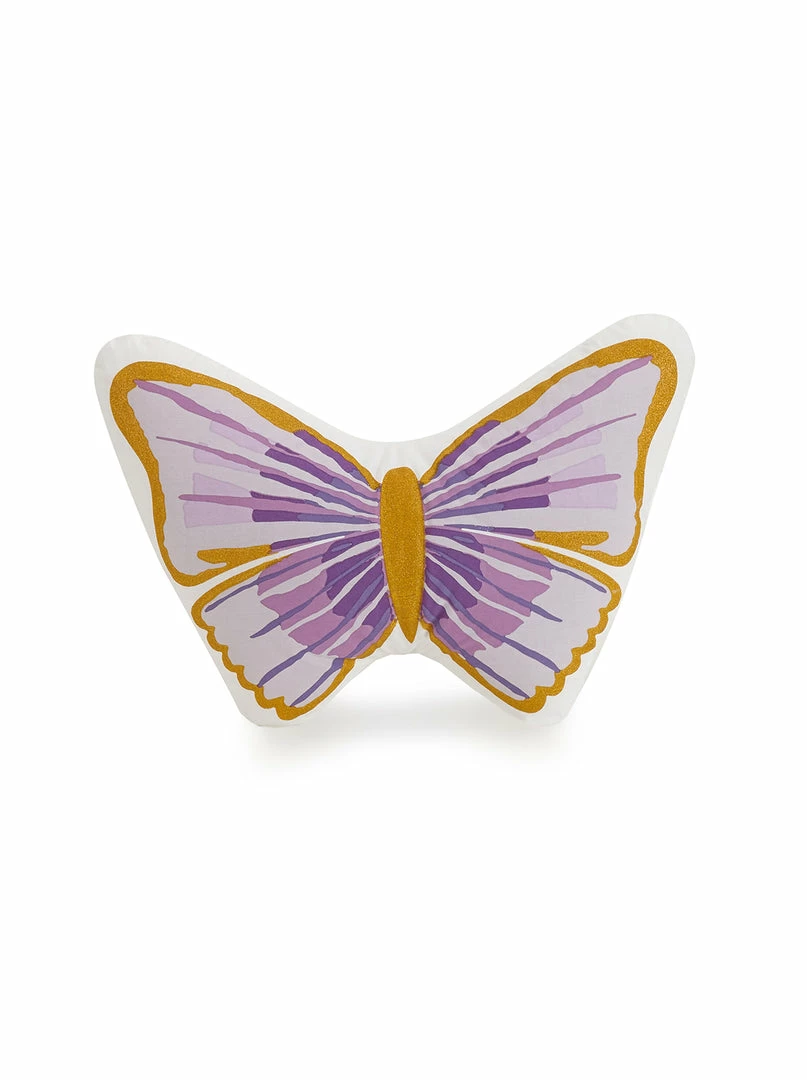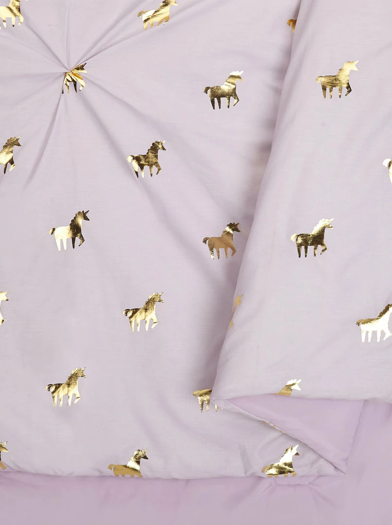 Golden foil printed unicorns on a pretty lavender ground. Comes with shams and the butterfly pillow.