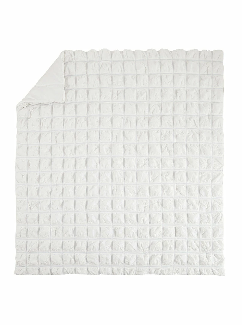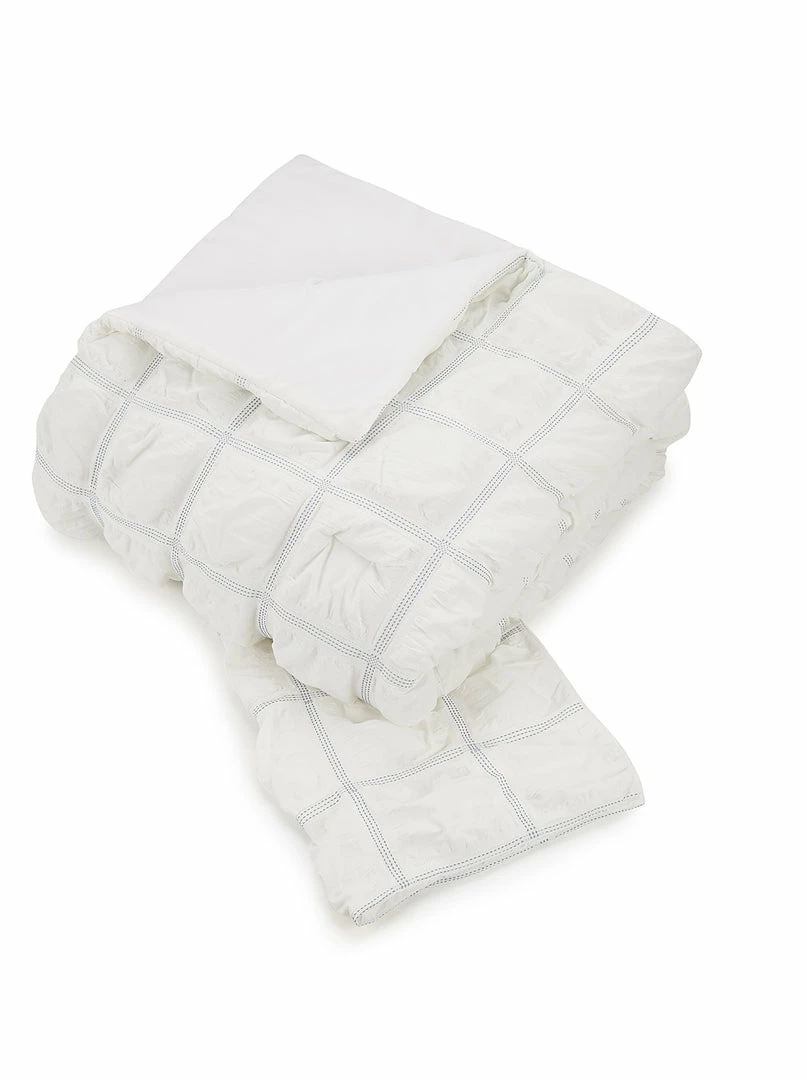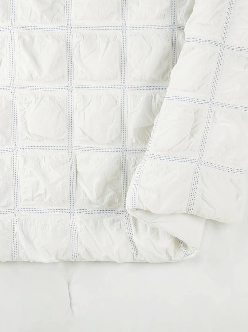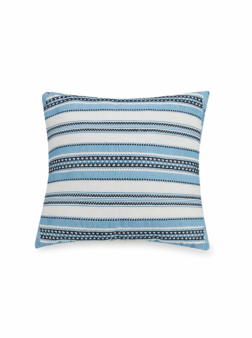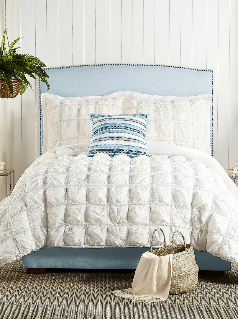 Soft powder blue dyed yarns woven into the white fabric create this casual take on the classic box pattern. An allover white crinkled texture and an embroidered stripe pillow complete the look. Bring yourself to the islands without leaving your bed! The Jessica Simpson Mykonos 4 piece comforter set includes a comforter, 2 pillow shams, and 1 decorative pillow.
